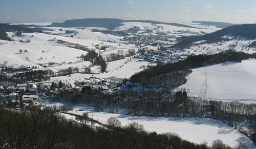 Wir stehen auf dem Remigiusberg bei Kusel und blicken in das Tal: