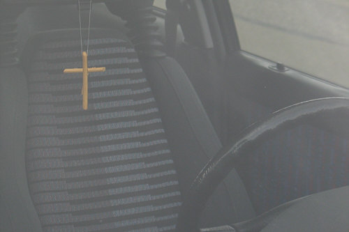 Ein Auto mit einem Kreuzanhänger ... das Symbol für Jesus ist da