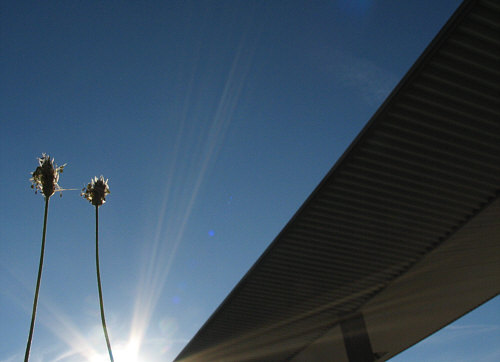Zwischen Wildkraut und dem Dach einer Bushaltestelle.
