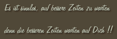 ![]() Diesen so passenden Spruch fand ich, während ich in der Gemeindeverwaltung auf die Rückkehr des Sachbearbeiters, der mal kurz zum Kopieren raus war, gewartet hatte. Der Spruch gefiel mir so gut, dass ich mir Kugelschreiber und Notizzettel von dem Schreibtisch des Herrn organisierte und diese Zeilen aufschrieb. Ich wünsche Euch für den heutigen Sonntag viel gute Zeit :)). Und denkt dran - Ostereier färben, es gibt was zu gewinnen. -- Willkommen bei meinen Sonntagsupdates: Updates auf Seelenfarben: Desktopmotive: Bilder der Woche Poesie: Gedicht der Woche Surftipps: HP der Woche und Zimmer mit Aussicht interessante Antworten: Interview der Woche -- heute geboren: Siegfried Matthus -- meine heutigen Grüße gehen nach: Halberstadt Sollte jemand zufällig in diesem Ort oder in der Nähe wohnen, dann würde ich mich über eine kurze Mail sehr freuen :)). Ihr seid toll - ich habe gleich sieben Mails zum Frankfurter Palmengarten (dessen Besucher ich gestern gegrüßt habe), bekommen - großes Dankeschön an Euch !! Mail 1 Hallo Engelbert, ja also den Frankfurter Palmengarten, den kenne ich nun sehr genau. Früher während des Studiums sogar wie meine Westentasche. Da hatten die Medizinstudent(inn)en nämlich die tolle Vergünstigung, kostenlos den Palmengarten zu durchqueren, um schnellstmöglichst von der Haupt-Uni zum Botanischen Institut zu kommen. Und manche Vorlesung wurde im Sommer geschwänzt und am Weiher im Palmengarten verbracht. Letztes Jahr war ich an Pfingsten mal wieder dort. Und die Bilder von diesem Besuch sind seitdem hier zu sehen. Mail 2 Hallo Engelbert! Wäre ja eine echte Schande, wenn ich als Hessin noch nicht den Palmengarten besucht hätte. Das erste Mal war ich mit der ganzen Schule im Sonderzug dort. Danach aber noch öfter und zu allen Jahreszeiten, denn er ist sogar im Winter sehenswert. Da das Wetter schön wird, ist es ein tolles Osterprogramm mit Kind und Kegel ab in den Palmengarten. Sie verstecken bestimmt auch wieder Ostereier. Mail 3 .... ja der Frankfurter Palmengarten ist schon etwas Besonderes ... ich war letztes Jahr öfter da, aber am eindruckvollsten fand ich doch das Lichterfest. Ich glaube, es wird dieses Jahr im Juni stattfinden und ist unbedingt empfehlbar!! Einfach nur eine wunderschöne Atmosphäre, schöne Musik und zum Abschluss das Feuerwerk ... traumhaft! Mail 4 zufällig wohne ich in Frankfurt :-) - und war natürlich auch schon im Palmengarten. Zu meiner Fotoclubzeit hatte ich sogar eine Jahreskarte und habe sämtliche Blumenausstellungen besucht und dort fotografiert. Gerade im Frühling ist der Palmengarten einen Besuch wert. Mail 5 *laaaach* - nee -- wohnen tu ich in diesem 'Ort' -- nich -- *lach* -- *zwinker* -- aber schön isses da wirklich -- da is mein Daddy mit mir früher oft hin -- Mail 6 Der Frankfurter Palmengarten ist ein Ort, der es echt verdient, auf deiner Seite genannt zu werden! Ich wohne seit 11 Jahren schon in Frankfurt und war seit dem unzählige Male schon im Garten. Es ist jedesmal wieder schön, mitten in der Innenstadt einen Platz zum Abschalten zu finden! Besonders freu ich mich auf das Lichterfest im Juni! Das soll besonders schön sein! Mail 7 Hallo Engelbert, mit deinem heutigen "Ort" hast du mich voll erwischt. Zwar Österreicherin, hab ich den Palmengarten vor 12 Jahren kennengelernt, oder besser "durchwandert", als ich für ein paar Tage eine Freundin besuchte, die damals in Frankfurt arbeitete. Das Wetter war zwar miserabel, erinnere ich mich, aber es war unglaublich beeindruckend, das weiß ich noch genau. Ich werde das nie vergessen, unglaublich schön. Das kurz zu meinen Impressionen zum Frankfurter Palmengarten. Danke nochmals an Euch für die Mails :)) -- zurück zur Kalenderblatt-Hauptseite Kalenderblatt-Archiv |