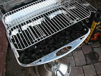 nicht mehr sauber ... edelstahlblinkende Zeit ade ... Dafür verheißen die Grillkohlen Hoffnung auf Gegrilltes. Es ist jetzt Sonntag Abend, genau 20.34 Uhr. Eine gute halbe Stunde soll es dauern, bis die Kohlen durchglüht sind, dann braucht das zu Grillende noch etwas, also hoffe ich mal, dass wir um 21.30 essen können. Mal schauen, ob wir den Zeitplan einhalten können. Die Kohlen haben wir übrigens mühevoll zwischen Grill und Boden "durchgeschubst". Weil die Seitenteile ohne den Grillrost immer zusammenfielen. Blöde Technik. Viel später ist mir dann eingefallen, dass man erst die Kohlen reinmacht und erst dann, wenn sie glühen, die Seitenteile aufsteckt und den Grillrost drauf. Probieren wir das nächste Mal. Jetzt muss erst mal Feuer in das Ganze ... |