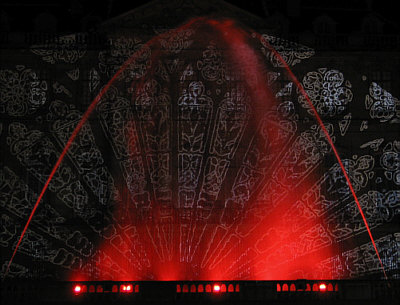 Ebenfalls rote Fontäne, aber andere Bilder ans Haus projeziert.