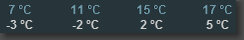 Montag 7, Dienstag 11, Mittwoch 15, Donnerstag 17 Grad.