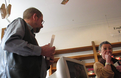 Frau (MissMarple) und Herr (Stuhlträger) Ladeninhaber sprechen über gute