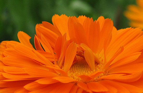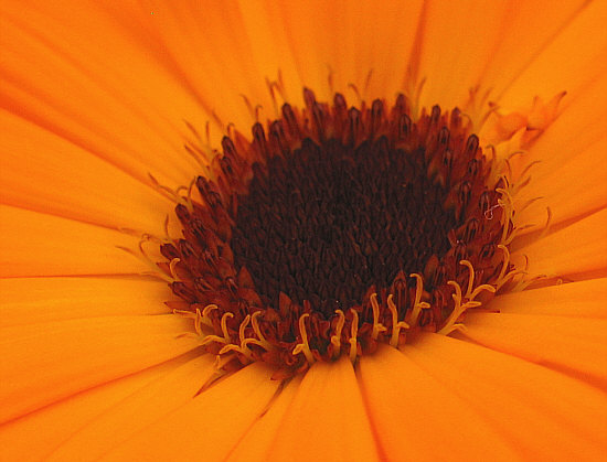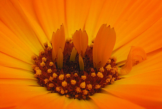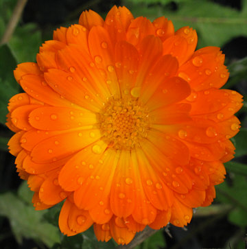 Ihr wissenschaftlicher Name ist "Calendula Officinalis" und sie ist ein Korbblütengewächs. Zu den Korbblütlern gehlren auch Sonnenblume, Löwenzahn, Astern, Schafgarbe und Artischocke. Und die Blume, die ich heute vorstellen will. Sie ist ganz unkompliziert, sät sich von selbst aus und blüht von Juni bis Oktober. Sie hat filzig behaarte Blätter und ist nicht nur schön, sondern auch sehr nützlich. Sie kann als Färbemittel von Käse, Butter und anderen Lebensmitteln verwendet werden. Früher hat man mit ihren Blätter Safran verfälscht. Die Blüten und die jungen Blätter sind essbar. Ihren ganz großen Auftritt hat diese Blume, wenn es um Salbe geht. Beate schwört darauf und hat inzwischen auch mich überzeugt, denn es gibt nichts Besseres für Wunden und Entzündungen. Blüten und Ziegenbutter gemischt hilft bei Wundheilungsstörungen und offenen Beinen. Tee aus der Blume hilft bei unregelmäßiger Periode. Frische, zerdrückte Blätter bringen bei täglichem Einreiben Warzen zum Verschwinden. Eine Tinktur aus dieser Blume hilft bei der Bildung neuer Haut nach Sonnenbrand. Die Blume selbst symbolisiert Anmut, Schönheit und treue Liebe. Bei vielen Völkern ist sie eine angesehene Friedhofsblume, während man sie bei uns früher häufig und heute immer noch ab und zu in Gärten findet. Diese Blume ist eine klassische "sie liebt mich, sie liebt mich nicht"-Blume. Man soll sie allerdings dennoch nicht abpflücken, weil man damit Gewitter heraufbeschwört. Es ist die Rede von der Letzen Sonntag bin ich einigen dieser Schönheiten mal etwas näher begegnet. Es war bei den "Weleda-Tagen" in Schwäbisch-Gmünd. Da standen sie auf einem Tisch. ![]() Daneben lagen Mittelchen, die man mit Hilfe dieser Ringelblumen herstellt. Die Leute liefen vorbei und einer blieb längere Zeit stehen. Um diese Bilder zu machen: Noch ein wenig geschlossen ![]() freundlich grüßend geöffnet ![]() Blick ins Innere, das manchmal hell und hier dunkel ist ![]() noch mal dunkel und doch ganz anders ![]() Nicht immer so geordnet, sondern manchmal dekorativ chaotisch ![]() oder mit Leichtigkeit verspielt ![]() auch ein einzelnes gefallenes Blatt ist der Star inmitten des Grüns ![]() Und wenn sie im Freien stehen und nass werden, so tut das ihrer Schönheit keinen Abbruch ... ganz im Gegenteil