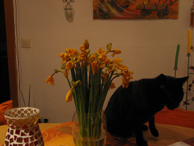 Hachherrje ... verblühte Osterglocken und Blacky auf dem Weg aus dem Bild