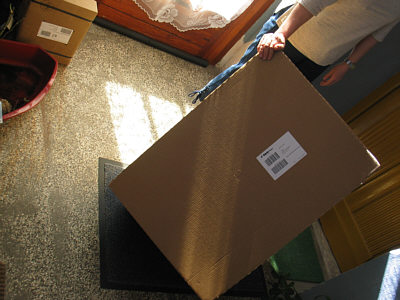 In unserem Hausflur, ein Paket und Beate dahinter. Ein gestelltes Bild