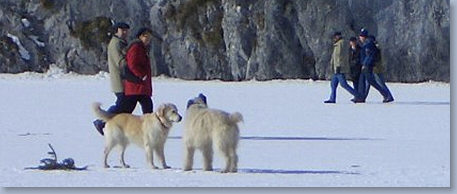 Ganz fasziniert stellte ich fest, womit man den See überquerte und wie viele Menschen sich auf dem Eis tummelten. Zu Fuß, mit Langlaufskiern, mit dem Fahrrad, im Rollstuhl, mit Schlitten – mit und ohne Rucksack, mit Hunden … die Einheimischen genauso wie die Touristen, es schien als ob man mit „Kind und Kegel“ unterwegs war. Dieses Ereignis, dass man den See zu Fuß überqueren kann hatte sich wirklich rumgesprochen und irgendwie wollte es jeder selber erleben und erfahren.
