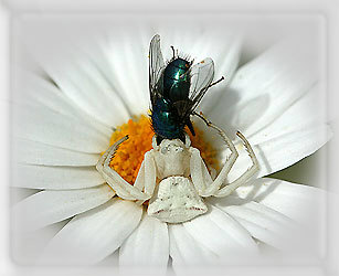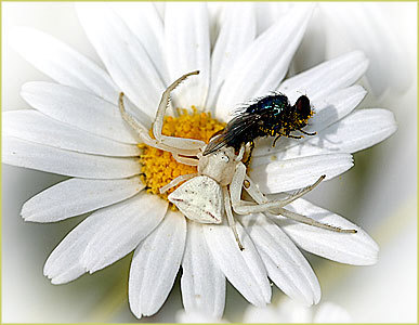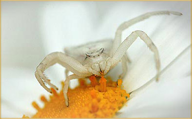 mit weit ausgestreckten Fangarmen, direkt in der Blüte sitzend,
