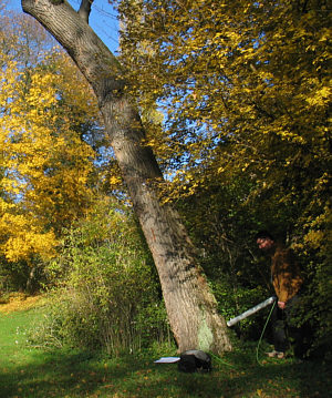 Da steht der Mann mit seinem Rohr am Baum: