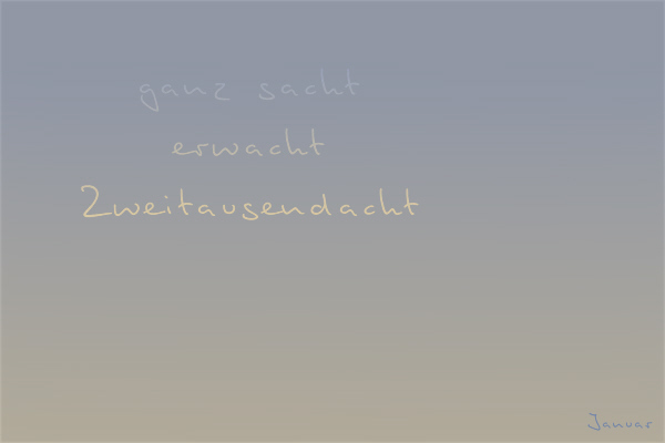 ![]() 2006 ein schinkelscher Segenswunsch 2007 auch blau und auch eine eigenes Textidee ![]() Ab 2008 war ich auf der Suche nach neuen Ideen für die Kalenderblätter. Bild- und Textkombinationen aller Art hab ich schon so viel gemacht, so dass ich mir immer überlege, auf welche neue Weise ich neue Horizonte finden könnte. Hier war es die Idee der "Nichtgestaltung" ... der Monat kaum sichtbar, den Text nur angedeutet ... um die sanfte Stille nicht zu zerstören. -- Februar