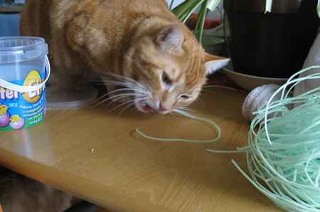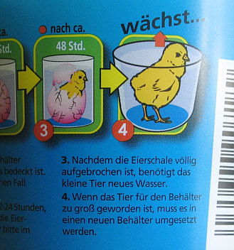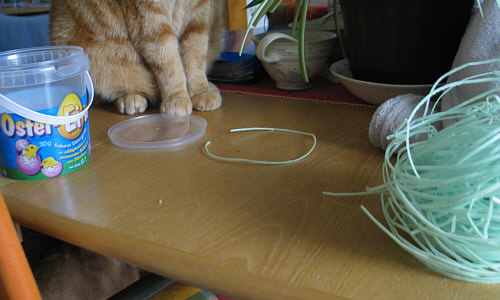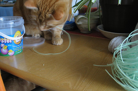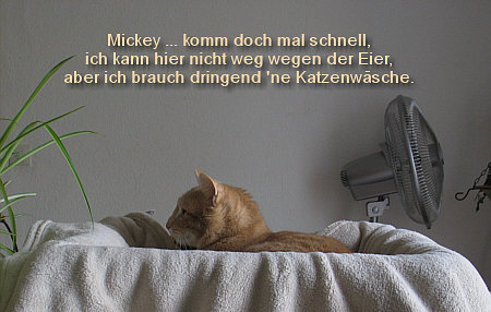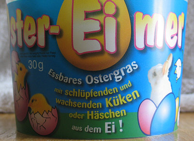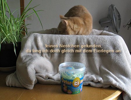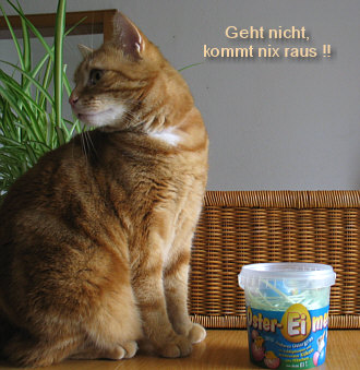 ... Hurz.Los gehts, die Kamera ist bereit, wir nähern uns ... ... ähm, ich würde sagen, "mir" nähert sich was. Wie schön ... ![]() ... pünktlich zum Feste ist mindestens ein Osterhase gekommen: ![]() Kaum hatte ich mich von dieser Überraschung erholt, passierte auch schon folgendes: ![]() Das war wohl eher eine Luftnummer *fg*. Mogli verschwindet verschämt ... und schon wissen wir, dass auch Mickey ein Osterhase ist. ![]() ![]() Hmm ... auch nix. Hüben wie drüben heißt es üben, üben, üben. Auf jeden Fall bin ich endlich wieder alleine. Endlich !! Endlich kann ich mit dem Fotografieren anfangen. Denn nichts anderes hatte ich im Sinn. Es geht um diesen Eimer und um ein Ei, das in ihm zu finden ist. Ein schönes, leicht satirisches Osterthema. Katzen wollte ich heute ausnahmsweise nicht fotografieren. Tja ... wollte ... aber es kam ja anders. Doch jetzt ... ist endlich mal Ruhe. Sogar die Decke liegt über dem Korb ... ![]() ... und gleich fange ich mit dem Fotografieren an. Hey ... was ist denn das schon wieder ? Der erste Osterhase ist zurückgekehrt. ![]() ![]() Eine Minute später reifte eine ganz wichtige Erkenntnis: Eierlegen macht schmutzig hinter den Ohren !! Denn: ![]() Nur Sekunden später: ![]() Weiter ging die Intensivreinigung: ![]() Irgendwann wurde mir das aber alles zu blöd. Ich hab doch nicht die Zeit, minutenlang in die Waschanlage zu schauen. "Hey, ihr Zwei ... habt Ihr nix Besseres zu tun ??". ![]() ![]() Da griff ich zu einer List und sagte "Ihr allerliebsten Stubentiger dieser Welt ... schnurri burri ... ... geht doch mal in die Küche ... ganz bestimmt ist dort die liebe Beate und macht Euch etwas Feines zu essen !". ![]() Und schon verschwand Mogli in Richtung Küche. Und Mickey ihm nach ... man könnte ja etwas Essbares verpassen. Und ich ? Ich konnte mich endlich mal mit dem Eimer befassen: ![]() Ein Oster-Eimer ? Nee, ein Oster-Ei-mer ? Denn da ist ein Ei drin. Und Gras. Das Ei ist blau, das Gras ist grün wohin das führt, wird man sehn. Worum gehts denn genau ? Um ... ![]() ... Gras, das essbar ist und um ein Küken, das aus einem Ei schlüpft. Aber nur, falls es nicht doch zu einem Häschen mutiert. Dieser Text klang für mich so seltsam, dass ich wissen wollte, was das ist und wie das funktioniert. Also erstmal die Bedienungsanleitung lesen:
