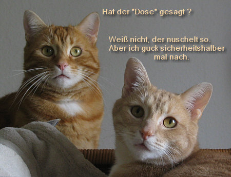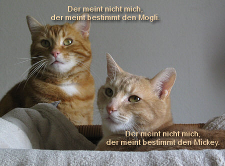 ![]() Hey, sag mal ... kennen wir uns ? Da wirst du ganz einfach und ungefragt von der Bedienungsanleitung geduzt. Aber Schwamm drüber, in China duzt man vielleicht früher. Also ... Ei in kaltes Wasser werfen, warten. Das sollte durchaus machbar sein ... ich geh dann mal ein Glas holen. Nee, halt ... erstmal Ei und Gras im Usprungszustand fotografieren: Der Eimer, noch verschlossen. ![]() Der Inhalt ohne Eimer drumrum: ![]() Aha ... so sieht das also aus. Das Gras ... und das Ei: ![]() Dann wollen wir mal das Ei ins Wasser legen. Damit das Tierchen rauskommt. Eine Art Unterwassergeburt also. Aber was ist, wenns geschlüpft ist ... Hunger hat ... und an meine Brust will ? Okay ... warten wirs erst mal ab ... ... und kriegen erstmal selber Hunger. Dieser Hunger lässt uns auf einmal ganz klar denken und die Erinnerung uns ein Bildchen schenken: ![]() Hey ... ja ... genau ... apropos Hunger ... das wäre doch eine gute Idee, wenn ich da mal ... ... ins Gras beißen würde. Gedacht Gesagt Getan ![]() Ihr werdet es kaum glauben, aber man kann das Gras wirklich essen. Fühlt sich an wie die Obladen in der Kirche, schmeckt aber viel süßer. Wenn man sonst nix hat und gleich verhungern würde ... ... apropos verhungern würde ... der Fressfeind naht *gg*: ![]() Mein ganzes schönes Abendessen war in Gefahr. Zuerst kam Mickey ... ![]() ![]() ... und der zweite Feind lauerte da schon unterm Tisch (links unten). Und dann kam Mogli: ![]() ![]() Sachen gibts, die gibts nicht. Und doch gibt es sie. Ich flehte. "Oooh, gibt mir mein Gras zurück" Ich kniete. Ich kniete und flehte. Da kam Mogli zu mir ... schaute mir tief in die Augen ... ![]() ... und sagte: "Okay, du kriegst dein Gras ... unter einer Bedingung". "Was muss ich denn tun" "Mach uns den Loriot !!" Und so kam es, dass ich mit unendlich trauriger Miene das tat, was ich tun musste, damit ich mein Gras behalten durfte ... ich machte ihnen den Loriot: ![]() Könnt Ihr Euch vorstellen, wie ich mich geschämt habe ? Könnt Ihr Euch vorstellen, wie sehr die Katzen über mich gelacht haben ? Und das Schlimmste ... zum Abschluss meinte Mogli noch süffisant: ![]() "Denk dran ... vor dem Essen das Beten nicht vergessen". Daraufhin wollte ich nicht mehr ins Gras beißen, packte meine Kamera und ging wieder dort hin, wo ich her gekommen war. |