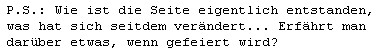 Eine Mail von gestern: ![]() Das kann ich gerne beantworten ... hier, wie sie entstanden ist, bei den alten Startseitenbilder wird dann die Frage nach den Veränderungen beantwortet. -- Im Internet war ich seit Anfang 1999 und irgendwann fand ich dort einen Link zum Thema "ADD" und darüber den Weg in eine Mailingliste. Dort war ich eine Zeitlang sehr aktiv und bekam neben Information und Diskussion auch viel schönes Feedback über meine Art zu schreiben. Und auch für meine Gedichte, die ich ab und zu dort postete. Irgendwann meinte die Heike (Grüße nach St. Wendel :)) ), dass ich unbedingt eine Homepage machen müsste mit meinen Gedichten drauf. "Kann ich nicht", "so gut sind die nicht", "meinst du wirklich" antwortete ich. Aber der Samen war in der Erde. Im August 2000 eröffnete ich dann Seelenfarben, damals noch mit "Windows Word" gemacht. Wenig Möglichkeiten, noch schlinmmerer Quelltext als ihn Frontpage fabriziert. Viele Dinge, die man als Webmaster gerne tun würde, gingen mit Word nicht. Da sagte dann die Jana, die ebenfalls in der Mailingliste war: "dann mache doch deine Homepage mit Frontpage". "Kann ich nicht" sagte ich wieder ... und doch ging auch das. Nicht sofort, nicht mit links, aber nach geduldigem telefonischem Support hatte ich dann die wichtigsten Frontpagekenntnisse ... und so startete dann im November 2000 Seelenfarben in etwa so, wie man die Seite auch später kennt. Drei Frauen brachten den Stein ins Rollen: Heike, Jana ... und Beate, meine Frau. Weil sie an mich glaubt, mich liebt und ... einfach da ist. Den Rest habe ich dann selbst in das Seelenfarbenbild eingefügt. Ein Bild, das immer größer und bunter und vielfältiger wurde. Eine Seite, die von Anfang an regelmäßig aktualisiert wurde. Eine Welt, die sich neben meinen Inhalten Stück für Stück mit dem Leben der Besucher füllte. Dankeschön an Alle, die an dem, was Seelenfarben heute ist, beteiligt waren und sind :)). |