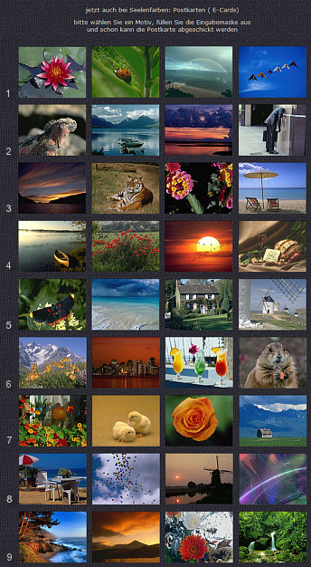 Oh Schreck, sie sind weg. So in etwa wahren meine gestrigen Gedanken, als ich entdeckte, dass das ja anders war als ich dachte. Im Juni 2001 gab es die ersten Grußkarten, ein Tipp vom Jörg. Ein guter, folgenschwerer Tipp :)). Also gestaltete ich eine Grußkartenseite ... mangels Digitalkamera und mangels Kontakten zu anderen Fotografen nahm ich Bilder von meinen Foto-CDs. Nun aber dachte ich, dass ich heute noch alle Motive hätte. Das die Nummer 1-30 auch damals diese Nummern waren. Doch ... oh Schreck ... ich hatte bei ersten Update die Karten, die nicht so oft verschickt wurden, nicht einfach nur rausgenommen, sondern mit einem neuen Motiv überspeichert. So habe ich heute nur noch die kleinen Bilder der damaligen Grußkarten, aber ... ... ich kann Euch noch die allererste Grußkartenseite zeigen: ![]() Das war das komplette Grußkartenangebot im Juni/Juli 2001. 36 Karten, mehr gab es nicht. Keine Karten mit Text und keine selbstfotografierten Motive. Einige Karten hat man nie wieder gesehen, andere sind auch heute noch im Sortiment. |
