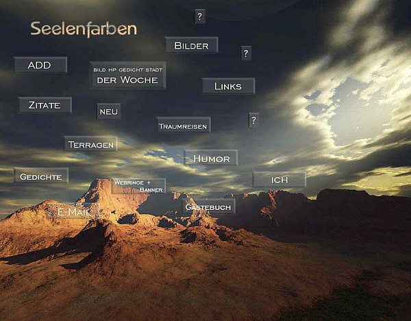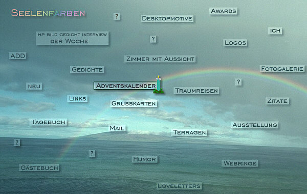 Am Anfang war die Idee. Dann kam das Papier. Danach das Gekritzel: ![]() Das war, und den habe ich immer noch und hüte ihn, der erste Seelenfarben-Startseitenentwurf. Daraus ist dann zuerst eine einfarbige Startseite entstanden, nur die Punkte der "... der Woche"-Rubrik waren farbig. Doch schon wenige Tage später sah dass alles anders und so aus: ![]() Das war die erste Seelenfarbenstartseite. In der obigen Form gab es sie aber nicht lange ... denn die Rubrik "buntes Internet, jeden Tag neu" war damals nur eine Idee geblieben und wurde schnell wieder runter genommen. Jeden Tag etwas Neues ... nee, das könnte dann doch zu stressig werden. Ähm ja ... ich wusste damals noch nicht, in welch umfangreicher und vielfältiger Weise ich Jahre später jeden Tag Neuigkeiten bringen werde ;)). Aber die Idee gab es damals, im August 2000, schon. Hinter Bilderwelt waren die Desktopmotive zu finden, ganze 4 Stück ;). Übrigens: wenn man die Seite "Faulheit" angeklickt hat, konnte man das da ... ![]() ... lesen *gg*. Zwei Monate später, im Oktober ... ![]() ... sah die Startseite so aus. Das waren nun keine Textlinks mehr, sondern einzelne kleine Buttons, die extra gestaltet waren und drüber lagen. Die Traumreisen gab es nun und die Fragezeichen. Und auch Terragen hatte ich inzwischen entdeckt. Hinter dem (...) fand sich ein geheimer Überraschungseingang, der sich "Wege" nannte. Ab 20 November 2000 begann die Frontpage-Zeit ... gleich mit einem neuen Bild: ![]() Es war sehr aufwändig, die einzelnen Buttons in die Grafik einzuarbeiten und ein Riesenaufwand, eine neue Rubrik zu integrieren. Die gesamte Seite mit mehr Bild drumrum: ![]() Am 18. Januar 2001 kam die Rubrik "Awards" dazu, am 4. Februar starteten "Art" und "Tagebuch". Es wurde also immer voller auf der Startseite. Und nun eine Version, die noch nie jemand gesehen hat ... ![]() ... denn diese braunen Buttons hatten sich dann doch nicht durchgesetzt, weil sie zu viel vom Bild weg nahmen. Fast ein halbes Jahr war dieses Bild auf der Startseite. Erst am 29. Juni wurde es dann doch sommerlich: ![]() Neu war das "Zimmer mit Aussicht", eine visuell auf besondere Weise ansprechende, wöchentlich wechselnde Linkrubrik. Aus "Art" war inzwischen "Ausstellung" geworden. Und die Grußkartenzeit hatte begonnen ... nun auch Grußkarten auf Seelenfarben. Damals hatte ich keine Ahnung, wie erfolgreich die werden würden. Bilderwelt hieß nun Bilder und es waren immer noch Desktopmotive dahinter zu finden. Am 30. August 2001 war wieder alles neu und anders: ![]() Neue Rubriken kann ich jetzt mal ausnahmsweise keine erkennen ;)). Was ich aber sehe, ist ein schiefer Horizont ... das würde es heute nicht mehr geben. Gerade mal vier Wochen später gabs eine Änderung: ![]() Neu war nun die Fotogalerie, denn ich hatte meine erste Digitalkamera gekauft. Damit es zu keiner Verwechslung mit meiner "Bilder"-Rubrik kommt, wurde diese dann in Desktopmotive umbenannt. Ein Fragezeichen kam dazu ... nun waren es 5. Im Dezember 2001 kam noch etwas hinzu: ![]() Es gab nun den ersten Seelenfarben-Adventskalender. Am 27. März 2002 gab es noch immer dieses Bild ... ![]() ... aber kamen wieder mal Rubriken dazu: Spaziergänge und die Oase. Und sogar eine eigene Rubrik für den Grafikwettbewerb (habe ich jetzt erst entdeckt, wusste ich gar nicht mehr). Ausstellung wurde auch noch in Malerei umbenannt. Insgesamt sage und schreibe 16 Monate war dieser Regenbogen über dem Meer auf Seelenfarben zu sehen. Erst am 25. Dezember 2002 gab es dieses Bild: ![]() Hier taucht zum ersten Mal die Rubrik "Kalenderblatt" auf. Eine Rubrik, die zu einem ganz besonderen Raum, zu meinem "Wohnzimmer", wurde. Es folgte dieses Motiv ... ![]() ... und ab Sommer 2003 läutete dieses Bild ... ![]() ... eine ganz neue Seelenfarbenzeit ein. Denn ab diesem Zeitpunkt waren die Rubriken nicht mehr "auf" dem Foto, sondern standen rechts davon ... und das ist bis heute so geblieben. Das war ein kleiner Ausflug in die Geschichte der Seelenfarben-Startseite. |