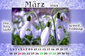 ![]() 2005: mein allererstes KB ... "wie wird’s wohl ankommen" ? 2006: das frische Küken geht mutig seinen Weg. ![]() 2007: alle Facetten des Frühlings in einem Kalenderblatt. Die Farben scheinen mir im Nachhinein etwas arg kitschig…*g* -- April