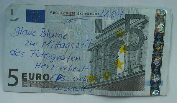5-Euro-Schein suche, etwas drauf schreibe und dabei auch noch lache.
