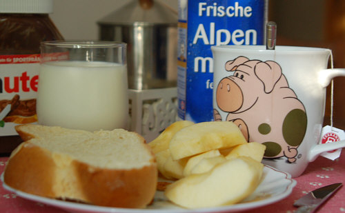 Apfel, Hefezopf ohne Rosinen (auf Nutella wartend), Milch und ein