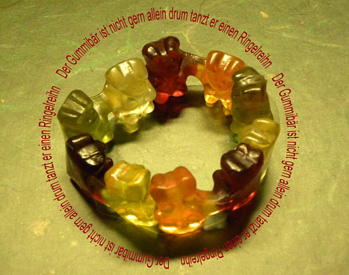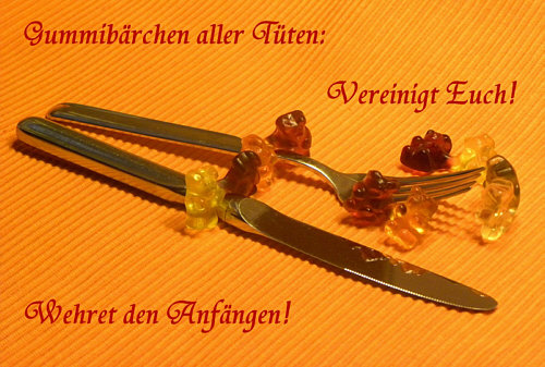 Gummibärchentanz Ganz leise, ganz leise ... drehn sie sich im Kreise ... doch dann werden sie immer schneller und schneller und die Gummibärenwelt, sie dreht sich rundherum ... ja, Gummibärchen sind nicht dumm. ![]() Nach dem Tanzen wird protestiert ... ![]() ... man sammelt sich und hofft so, noch möglichst lange verschont zu werden und noch möglichst oft Ringelreihen tanzen zu dürfen. Die Tanzlehrerin und Widerstandskämpferin ist übrigens Beate N. . -- Welch Duplizität der Ereignisse ... auch bei der anderen Beate (Schnecke) wird getanzt ... aber hier gibts eine zünftig karnevalistische Polonaise: ![]() -- Bis jetzt ist das alles ganz friedlich ... aber das wird sich nun ändern ... |