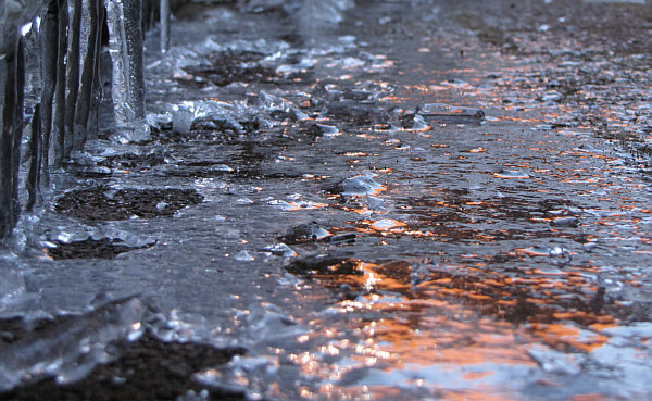 vorgestern: die Magie eines Morgens gestern: die Freude an der Bewegung heute: die Faszination der Veränderung V er änder u n g ... ein Neubeginn ... und was war denn vorher gewesen ? Nun ... im Prinzip nur Wasser ... ![]() ... aber eben in dieser weißen, festern Form. Da wünscht man sich doch sehr eine Veränderung ... wie wäre es denn mit Schmelzen ? Wie wäre es denn mit "von der Sonne streicheln lassen" und dann lustig davonfliessen ? Im Prinzip ist das ja schön und gut ... wenn nix dazwischen kommt. Wenn nicht die Sonne weiterzieht und das Tautröpfeln wieder erstarrt. Dann stoppt die Veränderung, dann erstarrt das Fließen. ![]() Bis zum Rande der Plane kam das Tauwasser ... quälte sich über den Rand und ermattete dann zu kalten Zapfen ... ... was dann aber richtig interessant aussehen kann: ![]() ![]() Und dann das: ![]() Feuer unterm Eis ? Alles fließt ? Nein, da bewegt sich gar nix ... und es ist auch kein Grad wärmer geworden. Es ist nur die tiefstehende Sonne, die, wenn schon nicht auf das Eis, so doch wenigstens aufs Nachbarhaus scheint und dieser warme Schein spiegelt sich im kalten Eis. Ich könnte auch einfach nur einen Ausschnitt vom obigen Bild nehmen: ![]() Was mag man glauben, was das ist, wenn man nur dieses Bild sieht und sonst keine Infos hat ? Es wäre ein tolles Rätselfoto gewesen ... und die Antwort wäre: die Faszination der Veränderung. Zwischen einer Plastikplane und den Steinen des Pflasters. Geschneit, getaut, erstarrt, beleuchtet. Ein fremdes wundersames Land direkt vor der Haustür. |
