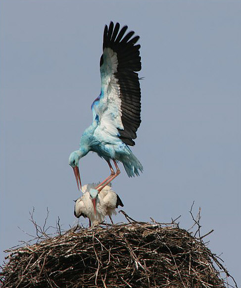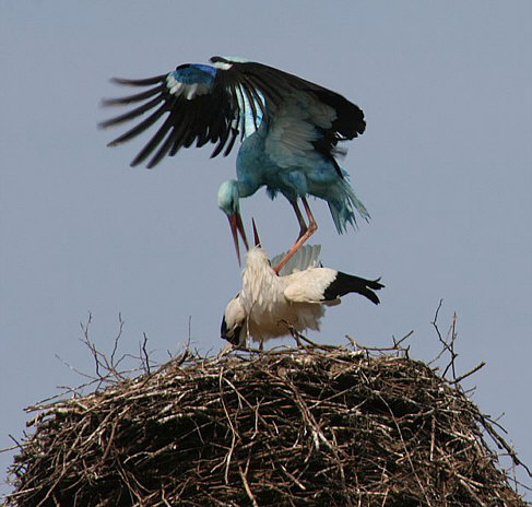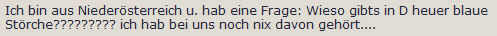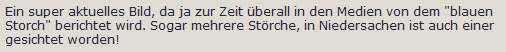 Vorgestern in der Kommentarfunktion beim "gemeinsam umblättern". ![]() Blauer Stroch ... sogar ich hatte davon gehört ... und bei uns in der Zeitung war auch ein Bild. Über die Grenze hatte es die Nachricht aber nicht geschafft: Die Kommentare waren vom 15. April ... einen Tag vorher schon war die Gitti unterwegs ... nichtsahnend, dass das einen Tag später auf Seelenfarben ein Thema werden wird. 60 Kilometer weit fuhr die Gitti ... denn in Biegen (Nähe Frankfurt/Oder) sollte auch solch ein blauer Storch gelandet sein. Insgesamt gibt es zwei blaue Störche in Deutschland. Warum blau ? Irgendwie ist der Storch mit Farbe in Berührunge gekommen, wie er das angestellt hat, wird sein Geheimnis bleiben. Darum rätseln wir auch nich lang herum, sondern schauen mal, was Gitti gesehen hat. ![]() Wie ... nur der Kopf blau ? Nee, das hier ist die Liebe ... diese Storchendame ist weiß. Das mal grundsätzlich ... aber wenn ein blauer Mann eine weiße Frau heftig liebt, dann überträgt sich die Farbe ... und so ist die Welt für die Storchenfrau diesmal nicht rosarot, sondern himmelblau ;)). Wo aber ist ihr Mann ? Das fragt sich auch die Gitti. Und sie fragte sich das nicht alleine ... denn wo es etwas Besonderes zu fotografieren gibt, da ist man mit seiner Kamera nicht alleine ... und so teilte sich Gitti auch den Platz mit einigen anderen Fotografen ... alle entäuscht, dass sie nur einen blauen Kopf sahen ... wo doch alles blau sein sollte. Aber der Herr ist unterwegs ... sucht er Futter ? Oder sucht er Baumaterial fürs Nest ? Oder geht er fremd ? 25 laaaange Minuten wartet Gitti ... und dann wirds ihr zu blöd und sie will gehen. Genau diesen Moment scheint der Storch abgewartet zu haben für seinen großen Auftritt. Voll himmelblaurosaroter Gefühle begrüßt er seine Angebete, dass es eine wahre fotografische Freude ist: ![]() ![]() ![]() Da freut sich doch jede Frau, wenn ihr ein blauer Mann in den Nacken springt *gg*. Drei Minuten hatten die Fotografen nun Zeit ... danach verschwand wieder Herr Storch und ließ seine Frau mit aller ihrer Sehnsucht nach ihm im Nest zurück. Wenn er dann wiederkommt, wird wieder geschnäbelt und mehr. Und hier ist das Nest zu finden: ![]() Das war ein Beitrag der Reihe "vorgestern gefragt - heute beantwortet". Ein kleiner Service vom Kalenderblatt ... und von Gitti :)). -- PS: von diesen Störchen kann man sogar etwas lernen ... nämlich, dass Äußerlichkeiten nicht das Wichtigste im Leben sind. Oder: ein gutes Make-Up ist durch nichts zu ersetzen ;)). |
