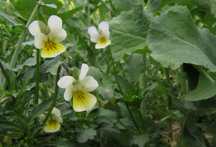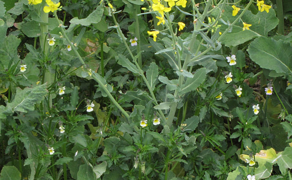 Da wachsen doch tatsächlich am Fuße des Raps so einige Hornveilchen.