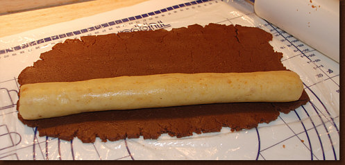 Diesen wickeln wir nun mit dem Schokoteig ein.