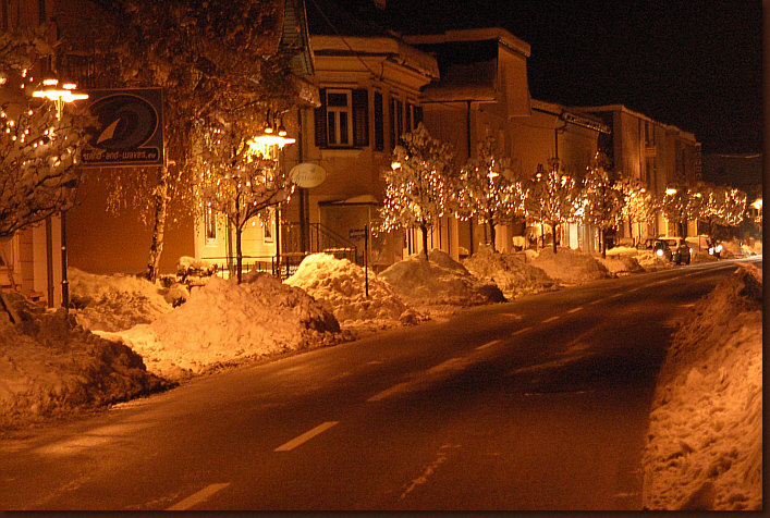 den gehäkelten Zuckerbäckerkunstwerken und dem Schnee am Abend.