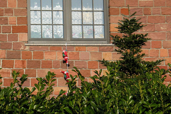 großes Fenster, eine große Hecke, ein großer Tannenbaum.