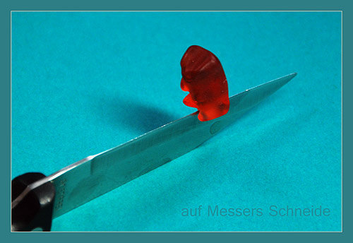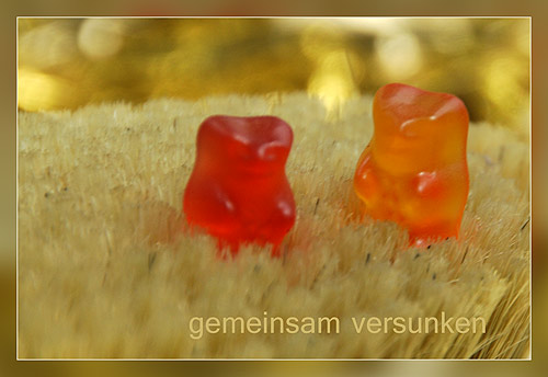 Manche baden alleine ... ![]() ... oder warten auf die Erleuchtung: ![]() Die kommt dann auch und heißt "Bärin". Die nimmt man dann mit auf eine Spritztour ... ![]() ... oder eine heiße Bürstenmassage: ![]() Danach wird sich abgekühlt ... aber jeder für sich: ![]() Falls die Liebste sich nicht mehr blicken lässt, dann macht er eine Mutprobe ... ![]() ... um ihr zu beweisen, wie stark er ist. All diese Bären trieben all ihre munteren Dinge bei Eva W.: ![]() Upps ... ist das Eva ? Oder wie oder was ? Es ist "Häuptling Philipp, der Schoschone unter den Bären". Schon früh umsegelte er die Welt, fand am Ufer eine Kamera und bei der Eva Asyl. So sagen es zumindest die Sagen ;). .. Morgen gehts schon weiter ... dann kommt die Bären-Kunstflug-Staffel. Das Bärenarchiv: Folge 1 - Folge 2 - Folge 3 - Folge 4 - Folge 5 .. Heute durften wir kennenlernen: die Bären auf ihrem gefährlichen Weg durch Erikas Wohnung, Evas baumbewohnenden Astbären und die Bären zwischen Schaum und Eis bei der anderen Eva.