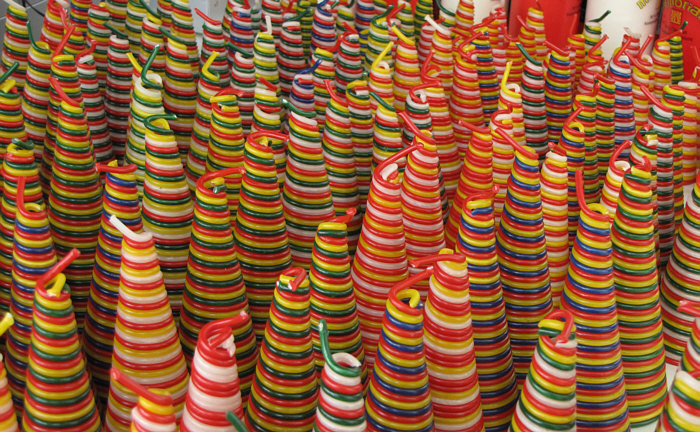 Das sind diese bunten Kerzen aus gedrehten Wachsschnüren.