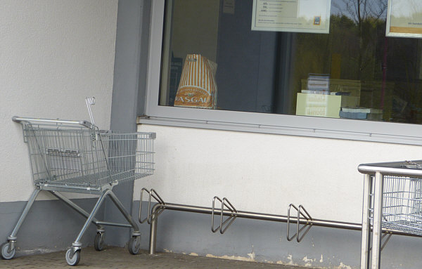 Wir sind schon hinter der Kasse ... bezahlt, Einkauf im Wägelchen ...