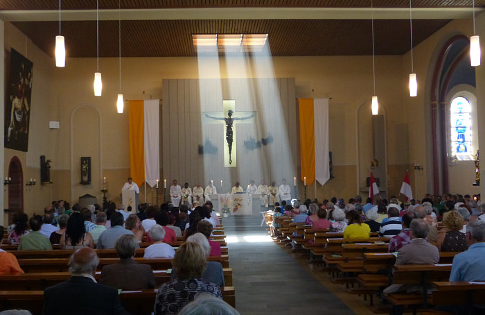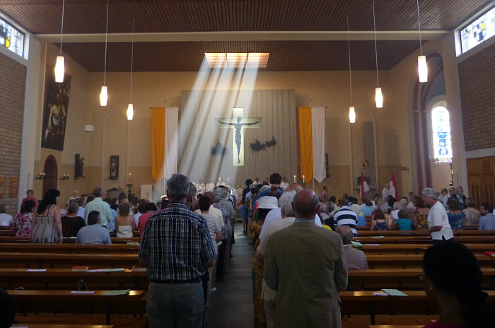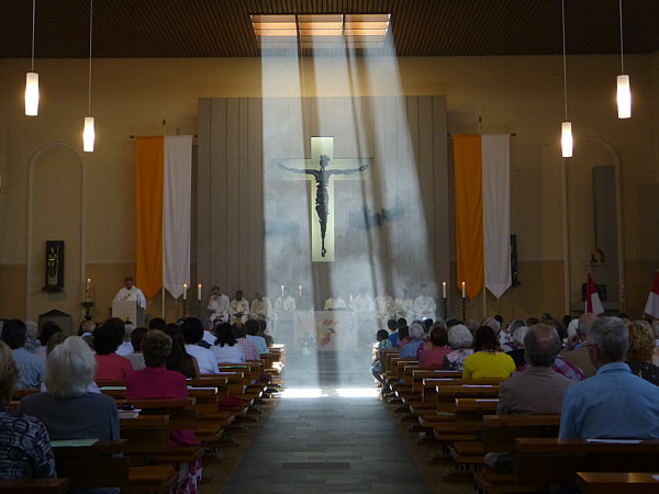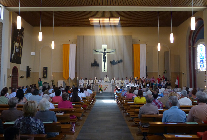 Gut gefüllte Kirche ... und sooo viele Menschen da vorne unterm Jesus