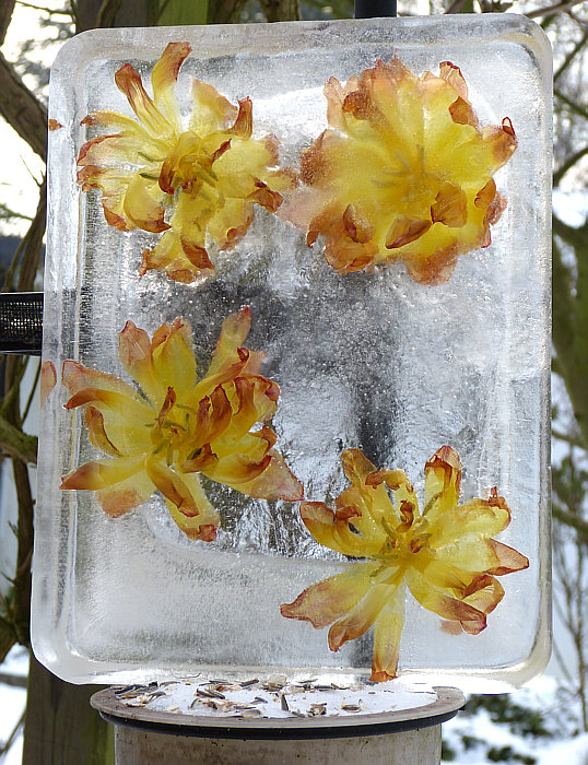 Nachmittags etwas Wasser in die Form gießen und Tulpen drauflegen.