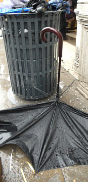 Du siehst Menschen, die unter Schirmen verschwinden ...