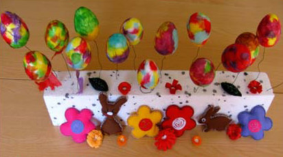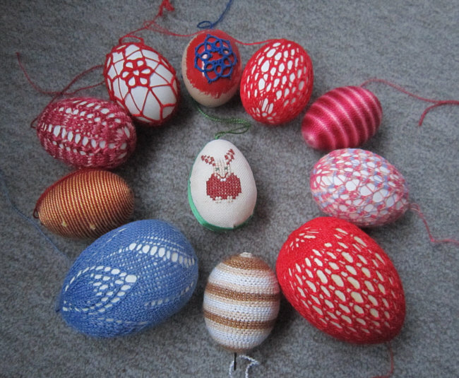 die Eier einfach nur mit Fäden (Wolle, Strickgarn) umwickelt.