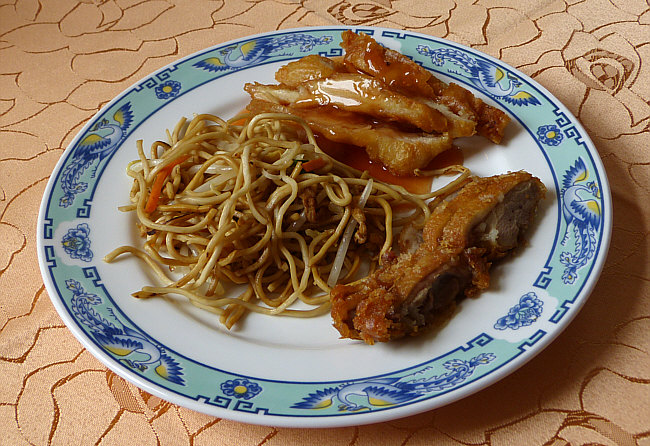 Soße süß-sauer und gebratene Nudeln.