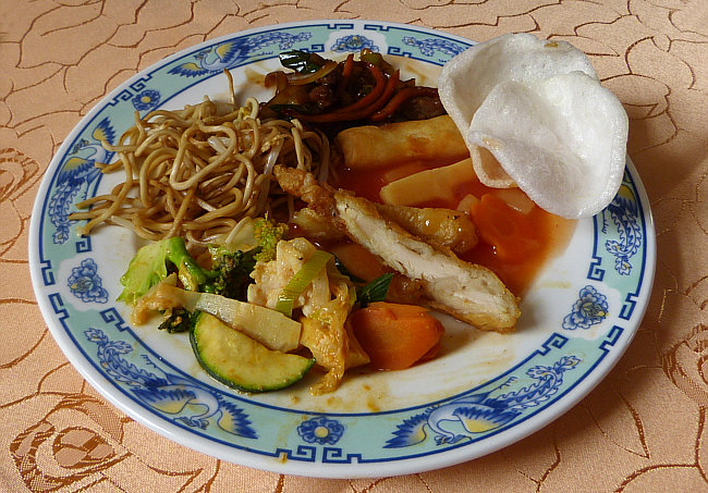 Gemüse süß-sauer, Hühnchen mit Gemüse scharf und Krupuk, das sind die