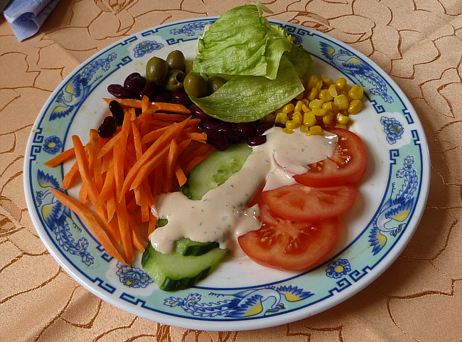 Karotten, Gurken, Tomaten, Mais, Salat, Oliven, Bohnen, Dressing