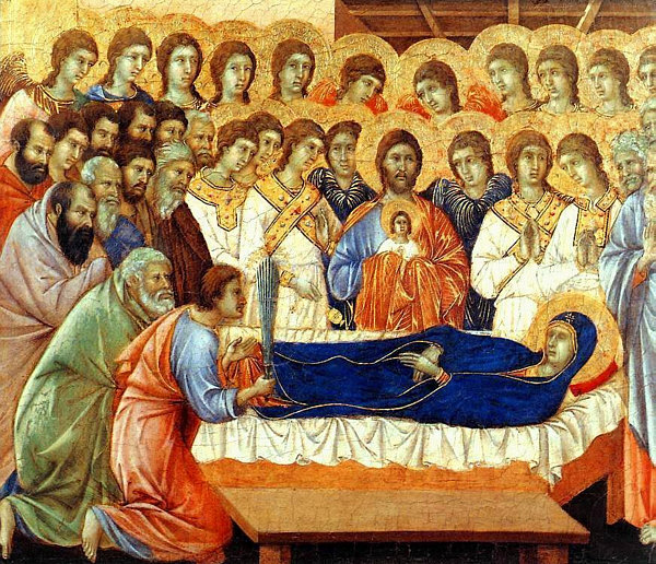Rotes Kleid Blauer Umhang Lange Haare Engel an ihrer Seite So wird sie oft dargestellt: ![]() (Guido Reni, 1580) Von Engeln getragen ... leicht leidender Blick. Oder in Ergebung auf das, was kommt ... der Himmel. Heute ist das Fest dieser Dame ... die Maria heißt und die Mama von Jesus ist. Was auffällt, sind die drei Engelköpfe unter ihr. Ist immer sehr gewöhnungsbedürftig, wenn etwas nur aus einem Kopf besteht. Oder besser aus einem Kopf mit Flügeln. Auch hier sind nur Engelköpfe zu sehen ... bzw. die Engel haben Wolkenkörper. ![]() (Leopold Layer, 19. Jh.) Hier sieht man aber auch Menschen ... und das passt, denn es wird darüber berichtet, dass die Apostel am Sterbebett waren und Maria nach deren Tod bestattet und das Grab mit einem weißen Stein verschlossen hatten ... aber sofort sei dann Christus mit den Engeln erschienen, der Stein wurde weggewälzt und Christus hat seine Mutter herausgerufen. Hier ... ![]() (Tizian, 1517) ... sieht man den Jesus sehr gut. Ein opulentes Bild ... das alles zu malen ... Chapeau. Jemand, der sich mit Kunst und/oder Geschichte gut auskennt, könnte sicher eine interessante Bildbeschreibung machen und uns auch einiges Details erklären. Ich kann nur, was ich sehe und empfinde, hier niederschreiben. Ich schaue einfach die Bilder an und schreibe meinen persönlichen Eindruck ins Kalenderblatt. Wer etwas besser weiß, der möge das bitte Kund tun. Dieses Bild ist übrigens in einer Kirche zu finden ... ![]() Foto: Schlaier - Lizenz: CC by-sa 3.0 ... und zwar in der Kirche "Santa Maria Gloriosa dei Frari" in Venedig, auch Frarikirche genannt. Das Bild wurde speziell für diese Kirche gemalt und 1518 am Hochaltar aufgestellt. Ein sehr großes Bild ... 6,68 x 3,44 Meter, gemalt in Öl auf Holz. In dieser Kirche ist auch das Grabmal Tizians zu finden. In Frankfurt am Main steht die Maria als Skulptur ... in der Marienkapelle des Kaiserdoms St. Bartholomäus: ![]() ![]() Foto: Magadan - Lizenz: CC by-sa 3.0 Vergleichen wir doch mal dieses Kunstwerk mit einer anderen Skulptur: ![]() Foto: Andreas Praefcke Es fällt auf, dass wir trotz aller Unterschiede verschiedene Menschen wiedererkennen. Der Mann in der Bildmitte oder der Mann rechts mit der Schrift. Oder der Mann mit dem "Helm" und der mit der "Kapuze". Kenner solcher Bilder können ganz bestimmt sagen, wer wer ist ... wenn ja, dann gerne, denn ich möchte jetzt nicht so ins Detail gehen. Dieses Werk ist übrigens in der Pfarrkirche St. Magnus in Bad Schussenried zu finden. Auch als Holzskulptur gibts die Todesszene Marias: ![]() Foto: Andreas Praefcke Und, ganz anderes Material und doch gleiche Szene: ![]() Foto: Joanbanjo - Lizenz: CC by-sa 3.0 Es ist durchaus faszinierend, wie unterschiedlich eine Szene dargestellt werden kann und wie bei allen Unterschieden stets klar ist, dass das das gleiche Geschehen ist. Es geht aber auch ganz anders vom Bildaufbau her: ![]() (Francesco Botticini, 15. Jh.) Oder so: ![]() (Lorenzo Lotto, 1506) Es gibt auch Bilder, die lassen das Geschehen auf der Erde ganz weg: ![]() (Nicolas Poussin, 1626) Hier sind nur Engel und die Maria zu sehen. Oder der Maler zeigt uns nur den Himmel: ![]() (Mariano Salvador Maella, um 1810) Zum Schluß zeige ich Euch noch vier Bilder, auf denen keine Engel fliegen, weil sie die Maria auf ihrem Sterbebett zeigen: ![]() (Duccio di Buoninsegna, 1308) ![]() (Anonym, um 1480) ![]() (anonym, um 1520) ![]() (anonym, um 1750) "Mariä Himmelfahrt" (genau: Mariä Aufnahme in den Himmel) ist in Österreich, einigen Kantonen der Schweiz und im Saarland und Bayern gesetzlicher Feiertag ... und in vielen weiteren katholischen Ländern. Ein Ereignis, viele Künstler, ein Gedanke, unterschiedliche Betrachtungsweisen. Es gibt natürlich unendlich viele weitere Bilder von Marias Himmelfahrt, ich konnte nur eine Auswahl zeigen und würde mich freuen, wenn das Lesen für Euch genauso spannend ist wie für mich das Gestalten war. |