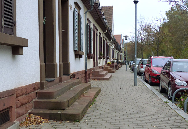 Eine ganz normale Straße ... vor den Häusern kleine Bäume, von der Stadt
