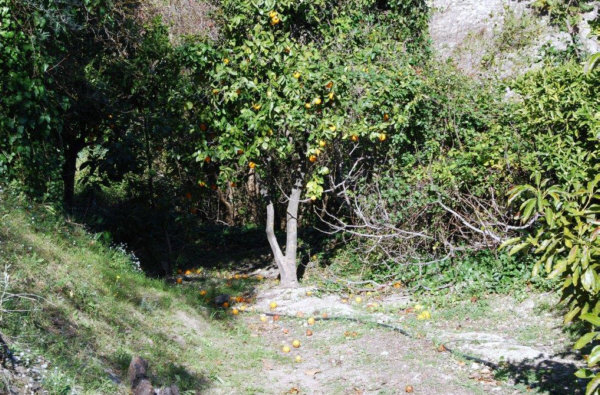 verlassene und abgeerntete Felder mit noch Früchten an den Bäumen und auf dem