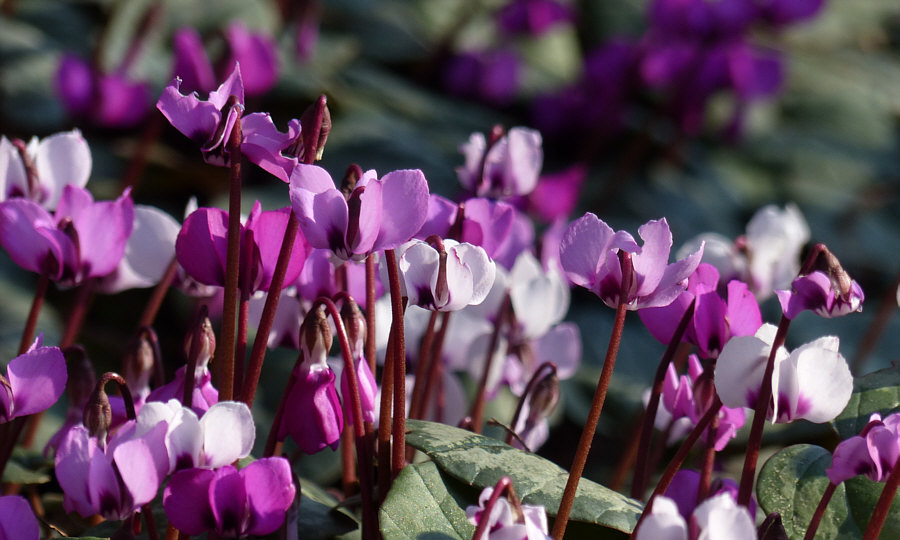 Mini-Alpenveilchen blühen an einer Stelle reichlich im Hermannshof.