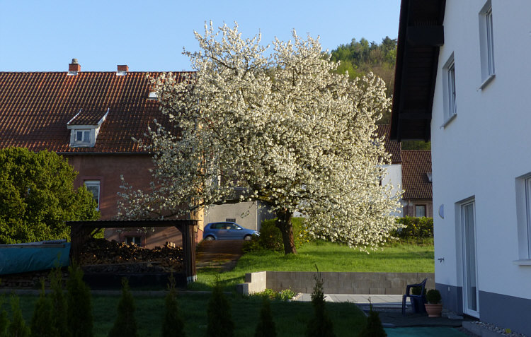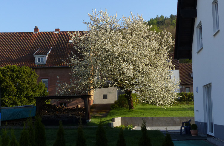 und von diesem aus blicken wir auf ein altes Haus mit altem Baum: