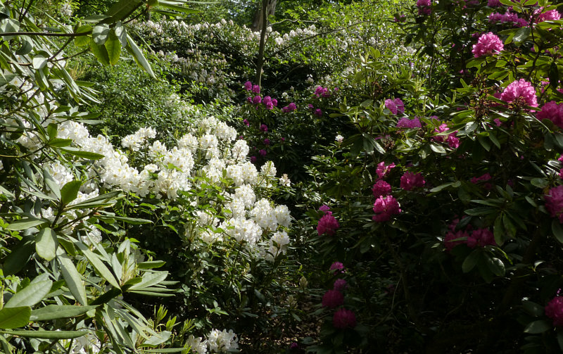 Nebenan blühten weiße Rhododendron mit gelben Herzen ...