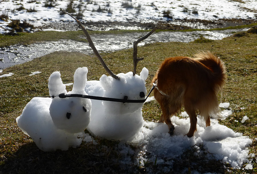 Das ... ![]() ... sind die armen Tiere ... Hase und Hirschilein ... gleich kommt Schiwawa ... ... mit seiner ganz speziellen Lederleinentechnik ... ![]() ... will er die beiden einfangen. Doch leider hat der Jäger Pech gehabt ... denn aus dem Nichts kam ein Bär ... ![]() ... und verjagt den Schiwawa. Alles wieder gut, die Welt ist wieder heile. Fotografiert von Lamarmotte (weder Hundemama noch Schneearchitektin, sondern nur die Fotografin). |