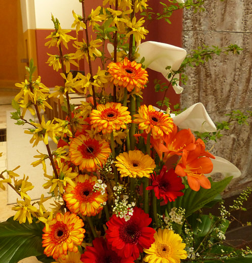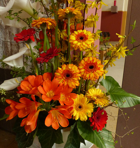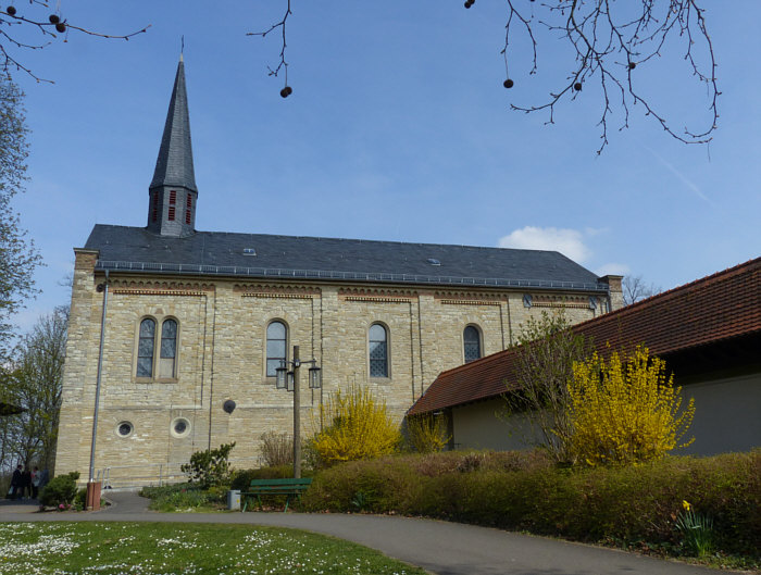 Hmm ... ![]() ... wattndas ... das steht ne undeutlich gemachte Frau vor einem unbekannten Gebäude, was will uns dieses Bild sagen ? Es will uns sagen, dass es uns nicht sofort alles sagen will ;)) ... und wir ... ... uns zuerst Mal das Gebäude von etwas weiter weg betrachten: ![]() Aha ... eine Kirche ... und vor der Kirche steht eine Frau ? Welche Frau ? Nu sag doch schon !! Gemach, gemach ... erst gehen wir mal rein in die Kirche: ![]() Hey, das ist ja die Sonntagskirche vom letzten Sonntag ... und da vorne das sind welche Figuren ? Die bunten, das sind farbige Keramikreliefs der 14 Nothelfer. Das andere sind Nazarener Bilder. Und in der Mitte 4,5 Meter hohes Pankrator-Glasmosaik. Wir gehen nach vorne und schauen zurück in Richtung Eingang: ![]() Wir drehen uns wieder um, denn wir stehen direkt neben den wunderschönen floralen Dekorationen ...