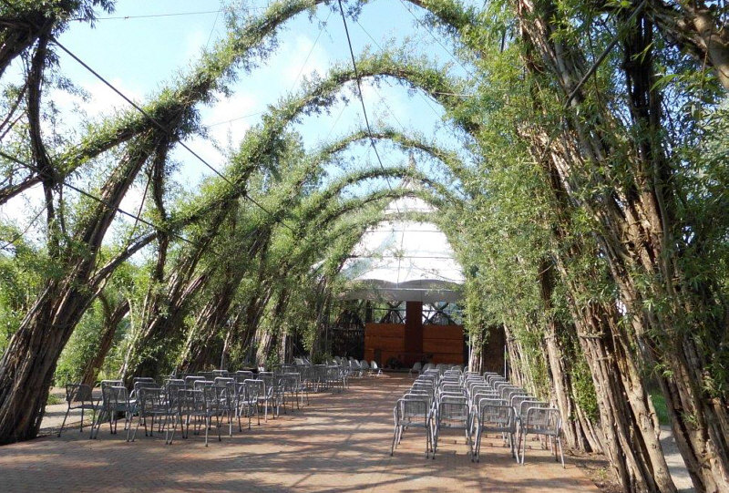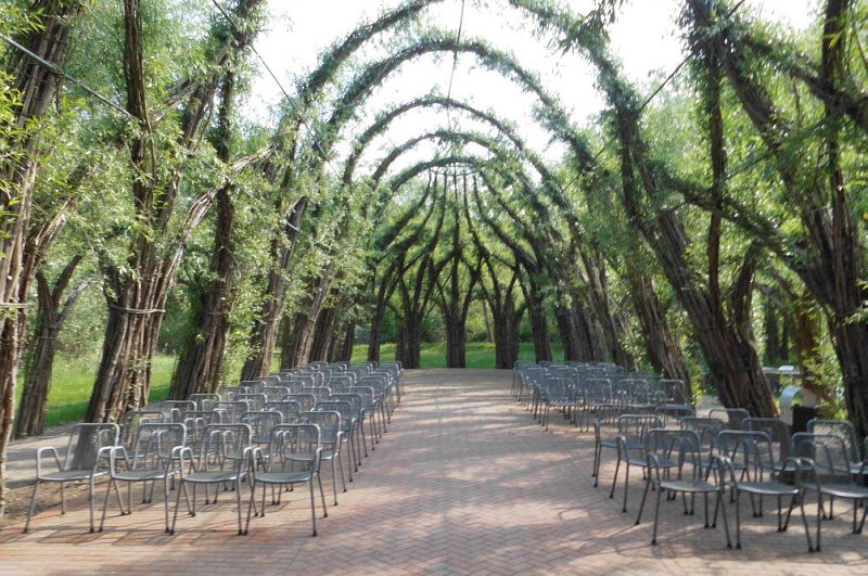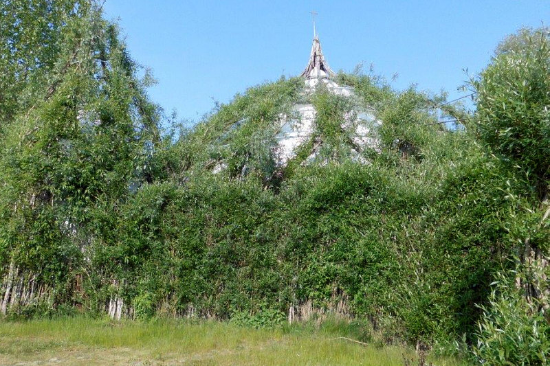 Wir gehen in eine Kirche, die aus einem Weidenwald besteht.