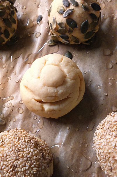 Die Brötchen nach Belieben in Sonnenblumenkernen, Sesam, Kümmel oder Kürbiskernen wälzen.